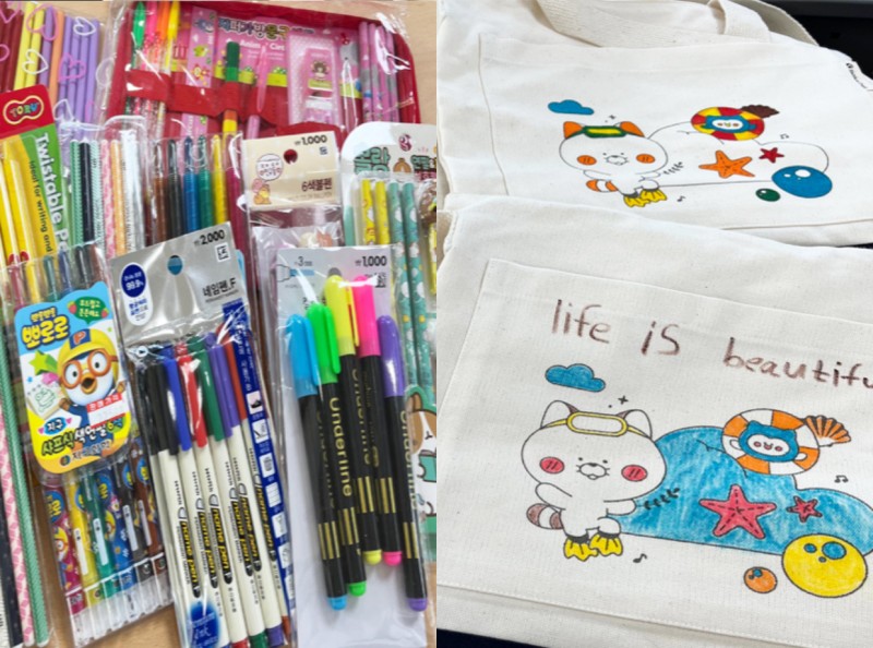 많은 봉사단원 분들께서 잘 색칠한 책가방 안에