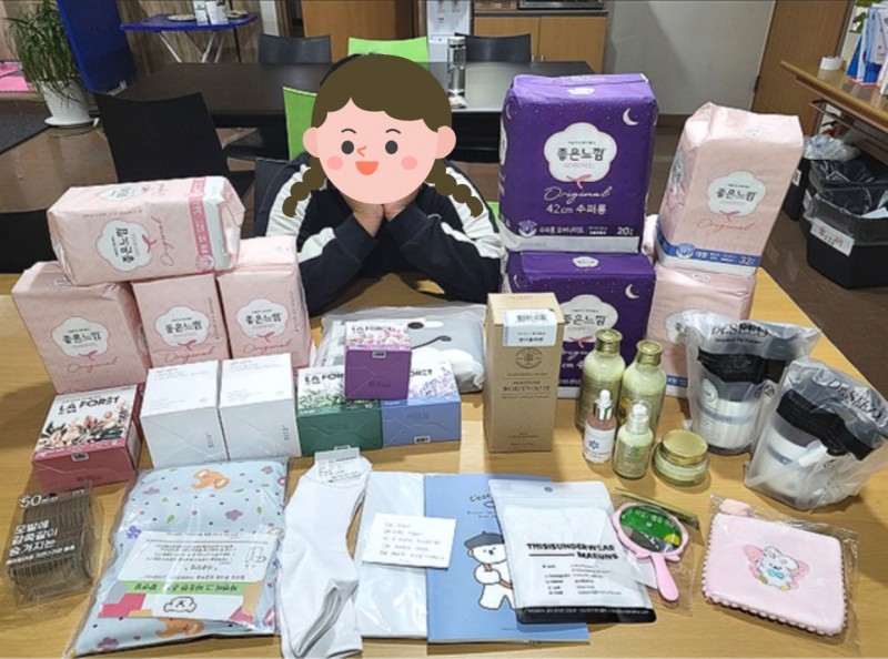 커다란 박스에 많은 양의 생리대와 화장품, 손편지 등등