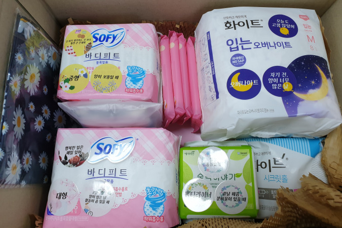 키트 안에는 6개월 분의 생리대와 위생팬티, 생리대파우치