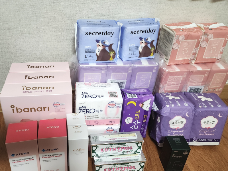 다양한 사이즈의 생리대, 여성청결제, 화장품, 마스크, 치약, 건강기능식품(철분) 등