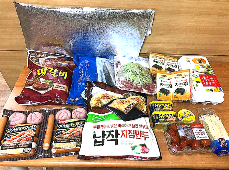고기, 과일, 유제품 및 야채, 햄, 만두, 김, 씨리얼 등으로 식료품 키트를 구성했습니다.